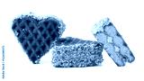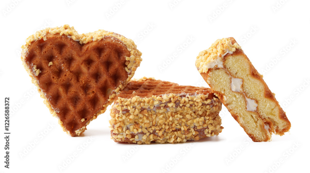Heart-shaped waffle dessert showcasing two unique flavors and textures on a plain background