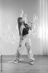 Young woman showcases creative dance moves indoors with playful light reflections on the wall