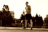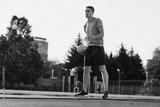 Young man prepares for soccer practice on a sunny day in a city park with green grass and trees