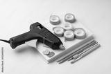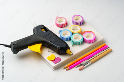 Crafting supplies for creative projects featuring a hot glue gun and colorful tape on a work surface