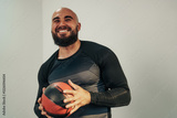 Smiling athlete holding a basketball indoors during a training session in a modern gym