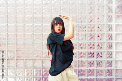 Dancer performing expressive movements against a textured glass wall in an urban setting