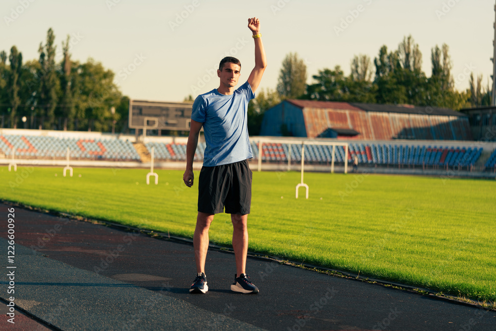 Young athlete celebrates victory by raising fist on stadium track during sunny afternoon