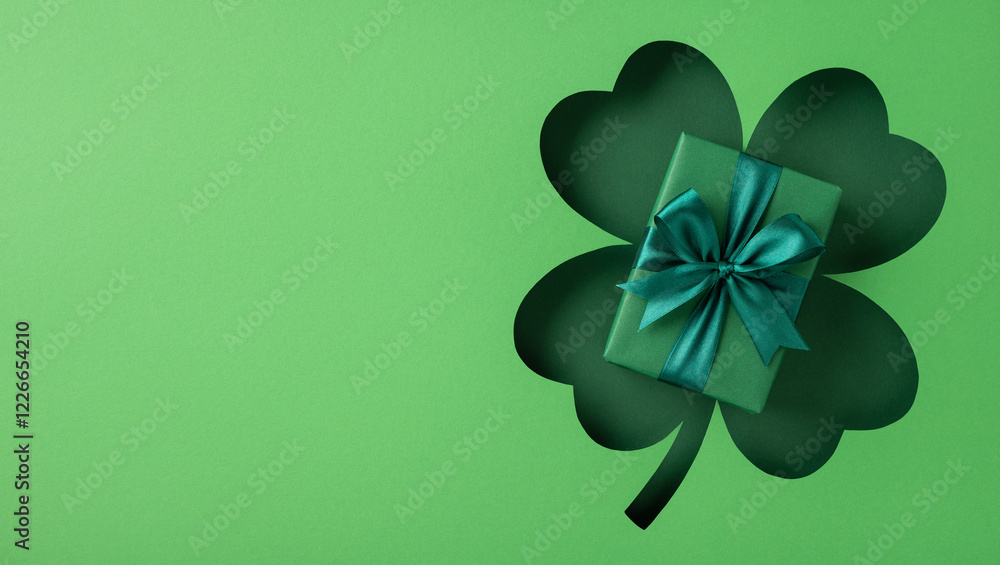 Elegantly tied green present on a clover leaf cutout design background in shades of green