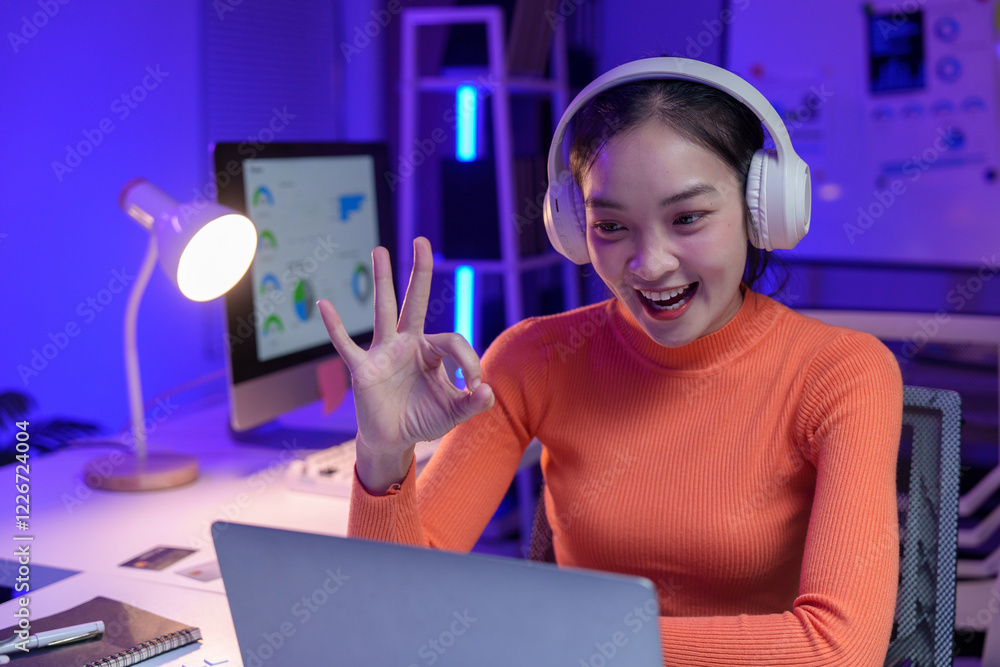 Enthusiastic young woman wearing headphones engages in an online video call. She sits at a desk with a laptop and a modern workspace setup, expressing excitement and connection