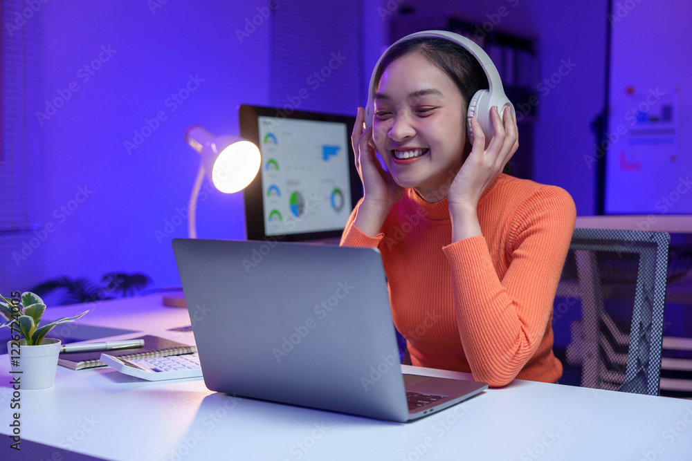 Smiling young woman wearing headphones, working on a laptop in a modern home office. Ambient lighting creates a relaxed atmosphere. Charts on the screen suggest data analysis tasks
