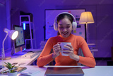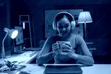 Young woman wearing headphones, enjoying a coffee while working late at a modern desk setup. The room is dimly lit with a cozy ambiance, featuring a computer, lamp, and potted plant