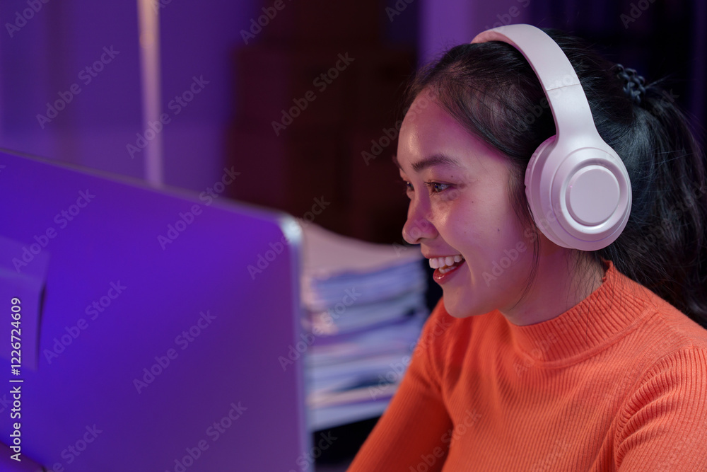 Focused young woman wearing headphones, working on a computer in a dimly lit room. Stacks of papers nearby suggest a busy work environment, emphasizing concentration and productivity