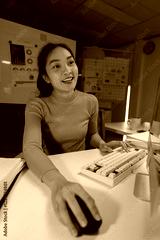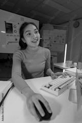 Enthusiastic young woman in a modern office setting, engaging with a computer. Bright and dynamic environment with charts and graphs in the background, suggesting a tech-savvy workplace