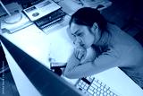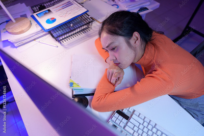 Tired woman in an office setting, leaning on a desk filled with documents and charts, indicating stress and burnout. Computer screen glows, highlighting the late hours of work