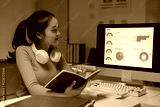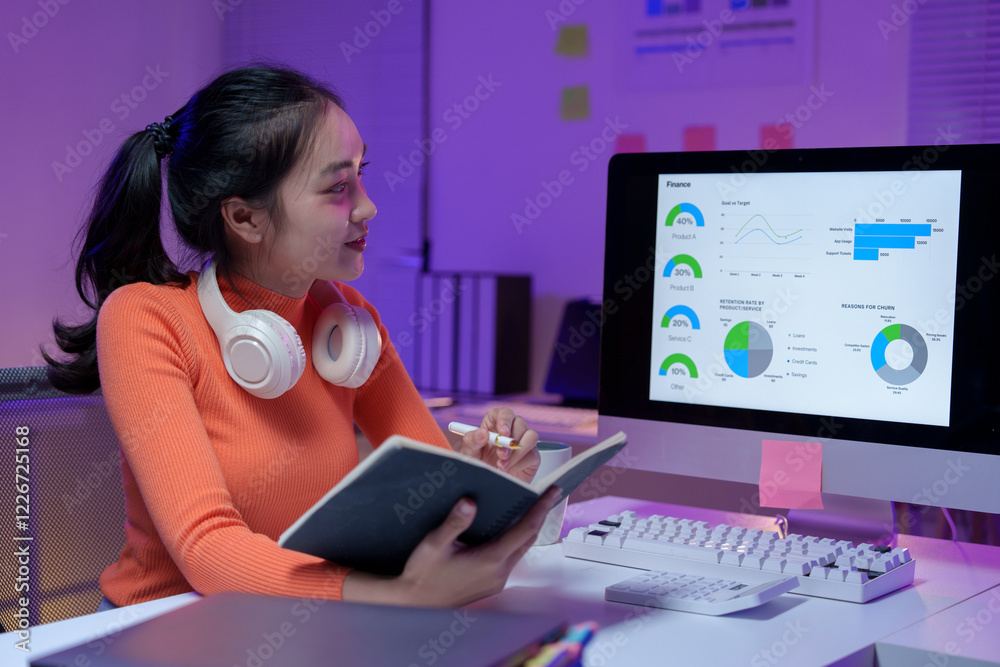 Focused young woman with headphones analyzing business data on a computer screen. She takes notes in a notebook, surrounded by a modern office setup with colorful charts