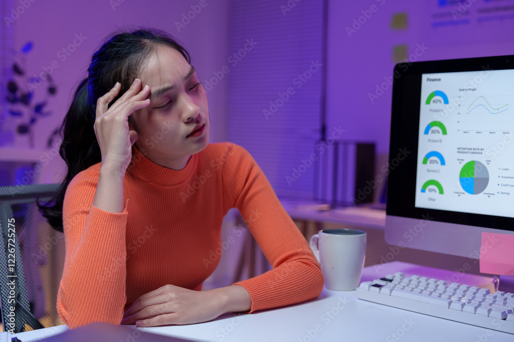 Young woman in an office setting, showing stress while analyzing financial graphs on a computer. Purple lighting creates a modern, high-tech atmosphere, emphasizing workplace challenges