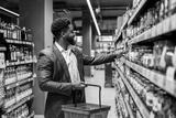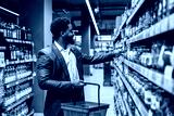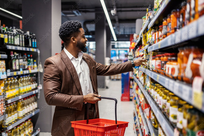 Young smiling elegant interracial shopper in suit choosing groceries from a shelf in supermarket.