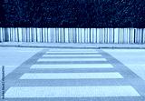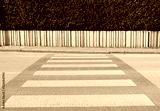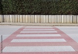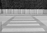 Prefab concrete fence with hedge on top at the roadside. Sidewalk, red and white crosswalk and street in front. Background for copy space