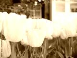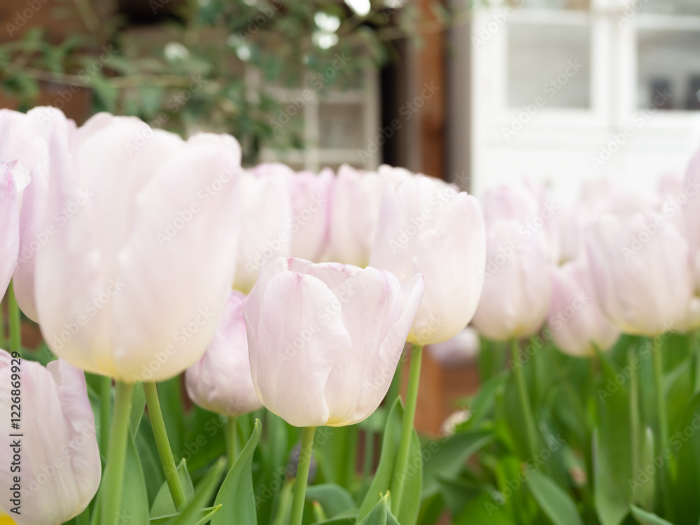 洋館の前に咲くピンク色のチューリップ