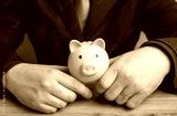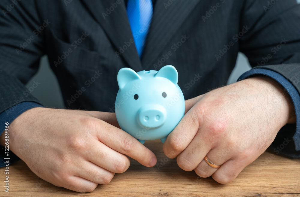 A businessman holds a piggy bank in his hands. The concept of thrift and financial policy. Savings and capital. Loans and deposits.