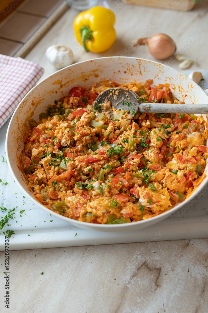 Turkish egg pan with vegetables. Delicious healthy low carb food fresh and homemade cooked
