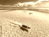 Aerial view of floating boat in transparent azure water on sunny summer day. Mnemba island, Zanzibar. Top view of yacht, sandbank in low tide, clear blue sea, sand, sky with clouds. Motorboat in ocean