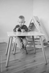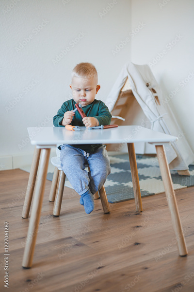 Toddler boy in a bright room sits at a children's table and plays with toys. Furniture for children. Table and chairs for babies. Child development