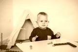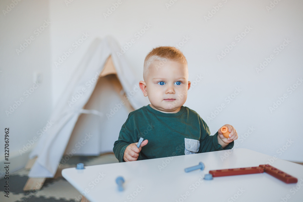 Blond boy toddler playing with toys in children's room close-up and copy space. Child sitting on a stool at a table. Furniture for children