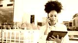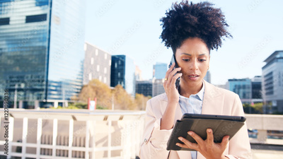 Businesswoman Talking on Cell Phone While Using Tablet in Modern Urban Setting