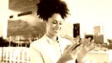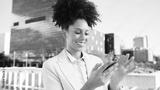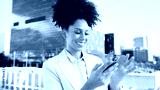 Smiling Businesswoman Using Smartphone Outdoors in Urban Cityscape