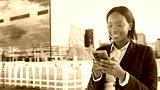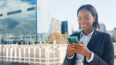 Professional Woman Smiling While Using Smartphone Outdoors in Urban Setting