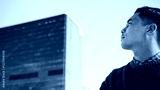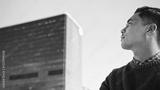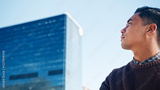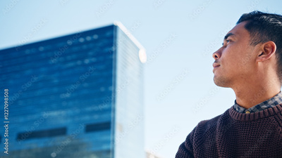 Confident Young Man in Urban Cityscape Looking Up at Building on Sunny Day