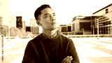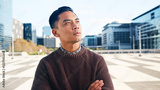 Pensive Man Posing in Urban Cityscape with Modern Architecture and Bright Sky Background