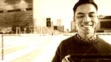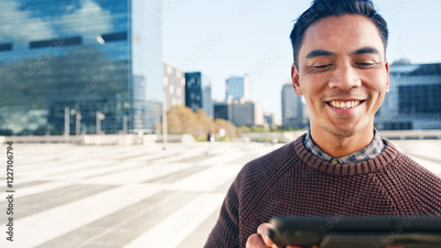 Smiling Man Using Tablet Outdoors in Modern Urban Setting