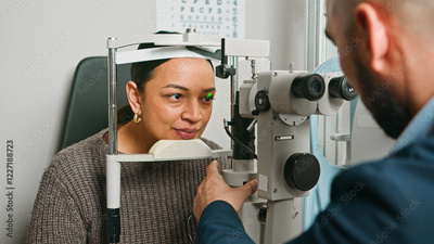 Optometrist Conducting Eye Exam for Patient Using Medical Equipment