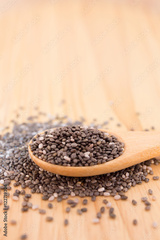 Close up of Chia seeds in a wooden spoon on the table