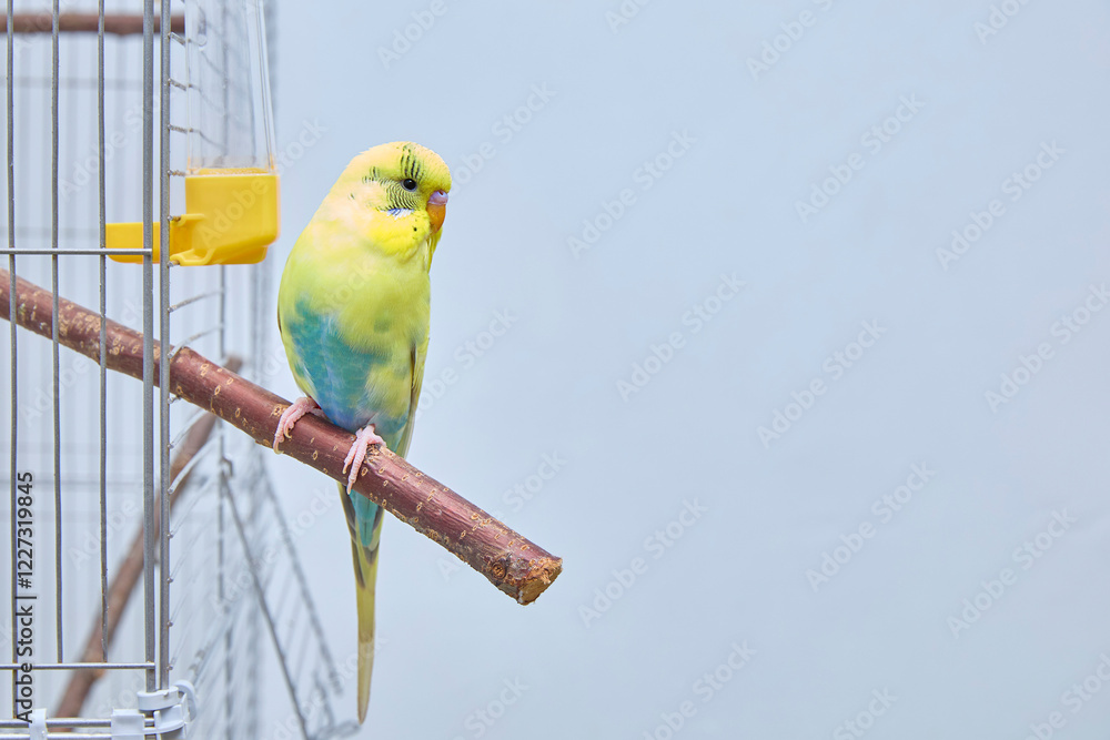 Budgie on a perch near a cage with a place for a text or product. Copy space