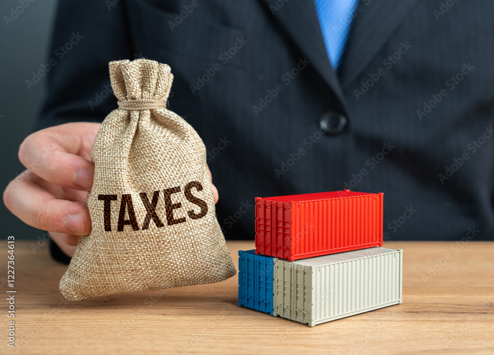 A businessman holds a bag of taxes received from trade and import duties. Government income, taxation policies, and economic growth through regulated trade.