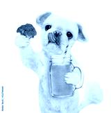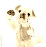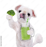Dog holding smoothie in a mug isolated on white.