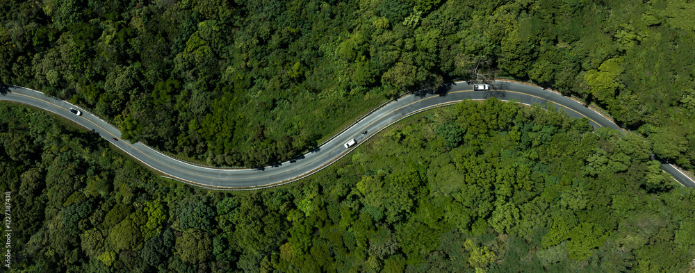Car in rural road in deep rain forest with green tree forest view from above, Aerial view car in the forest on asphalt road background, Electric vehicle EV car drive asphalt road green tree forest