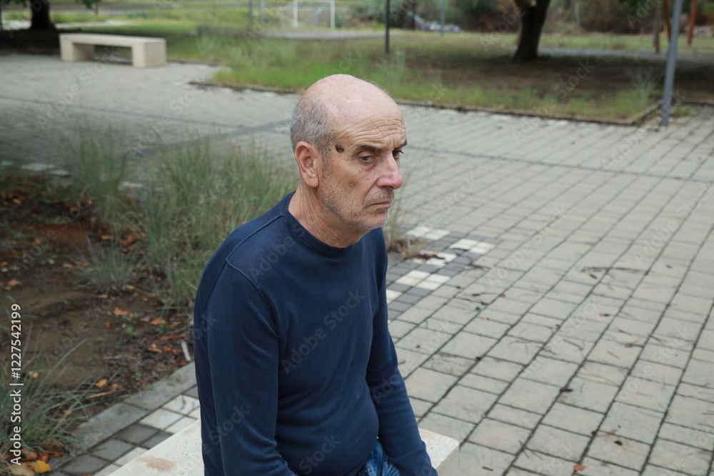 Serious Elderly Bald Man Looks Around Seated in Nature Park