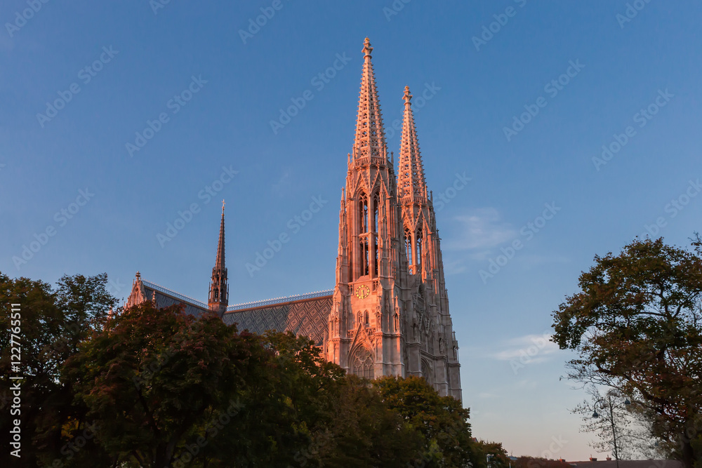 Spires of Neo-Gothic Votive Church in Vienna at sunset