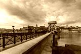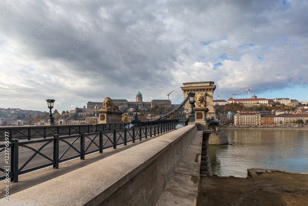 Szechenyi Chain Bridge over Danube in autumn overcast morning, Budapest