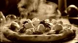 Close up Fresh baked hot Italian Pizza with steam with buffalo mozzarella and basil, tomatoes and mushrooms, pizzeria.
