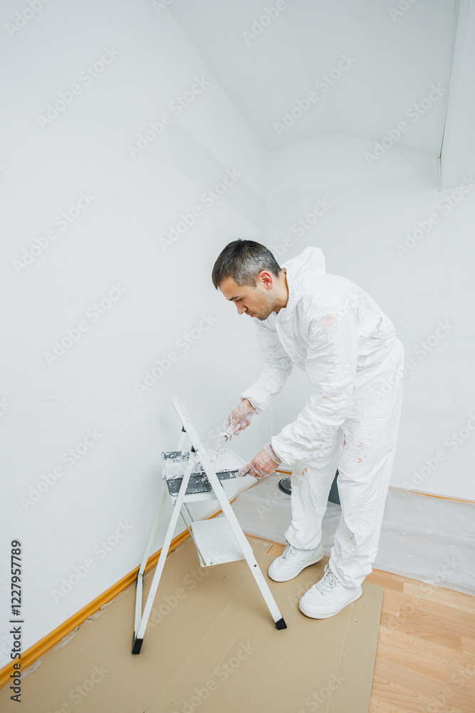 Renovation of the premises. A young man with dark hair paints the wall white in the apartment. He holds a roller in his hands. The concept of cheap repairs.