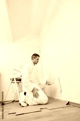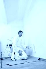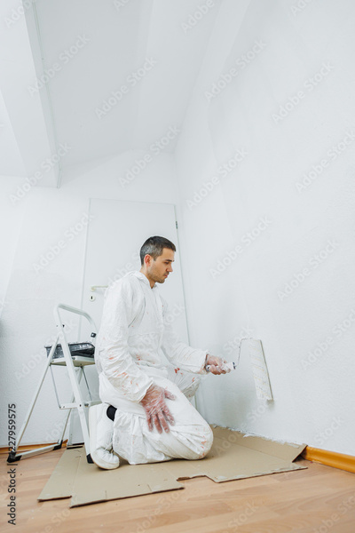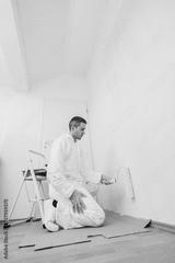 Renovation of the premises. A young man with dark hair paints the wall white in the apartment. He holds a roller in his hands. The concept of cheap repairs.