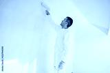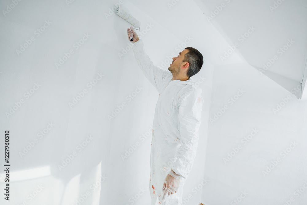 A man in a white uniform with a roller in his hand paints the ceiling white at home. Renovation of premises.