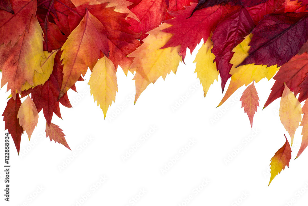 Colorful autumn leaves border isolated on white.