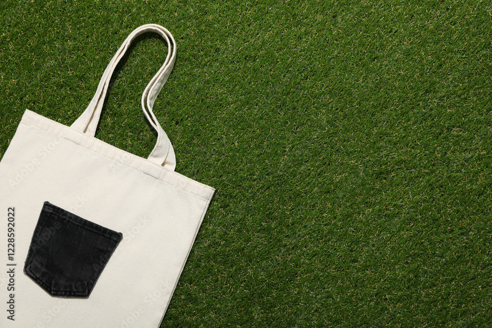 Handmade cotton bag on green background, space for text