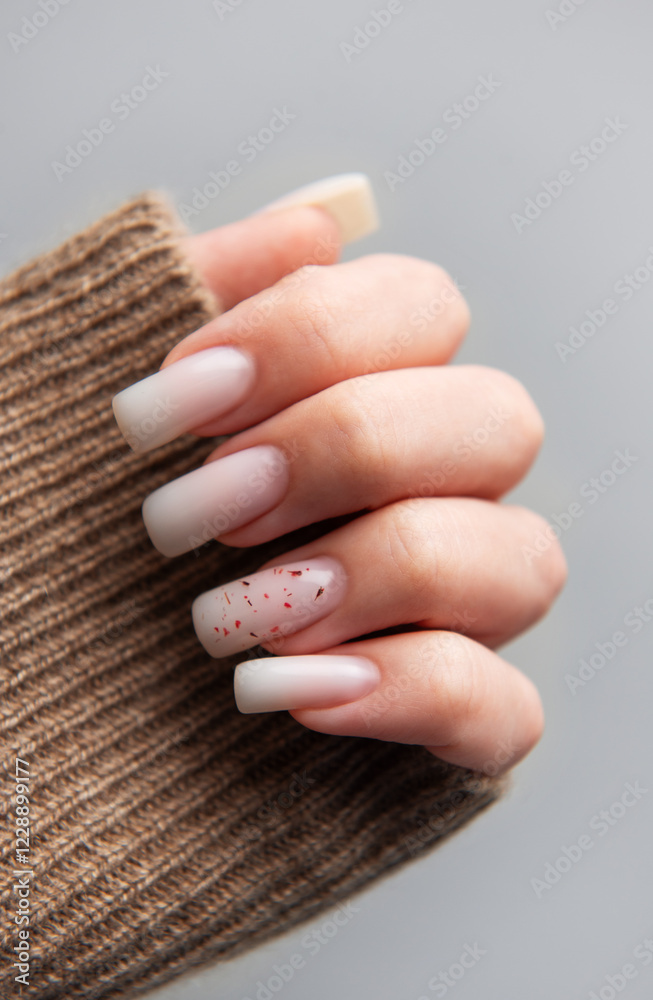 Woman showing stylish pink manicure with brown sleeve on grey background