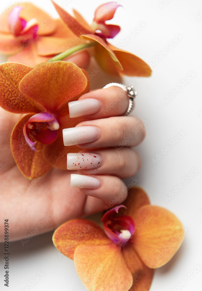 Woman hand showing stylish trendy nude manicure holding orange orchid flowers