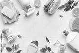Eco friendly cleaning products and lemon on white tile background creating frame