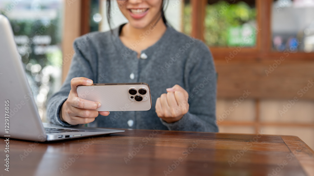 A happy Asian woman enjoys playing a mobile game while working remotely at a coffee shop.