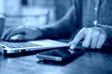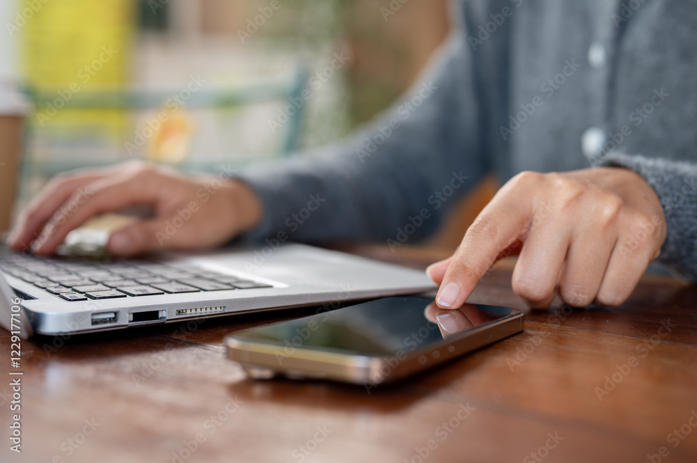 A close-up of a woman pointing at a smartphone on a table, working remotely at a coffee shop.